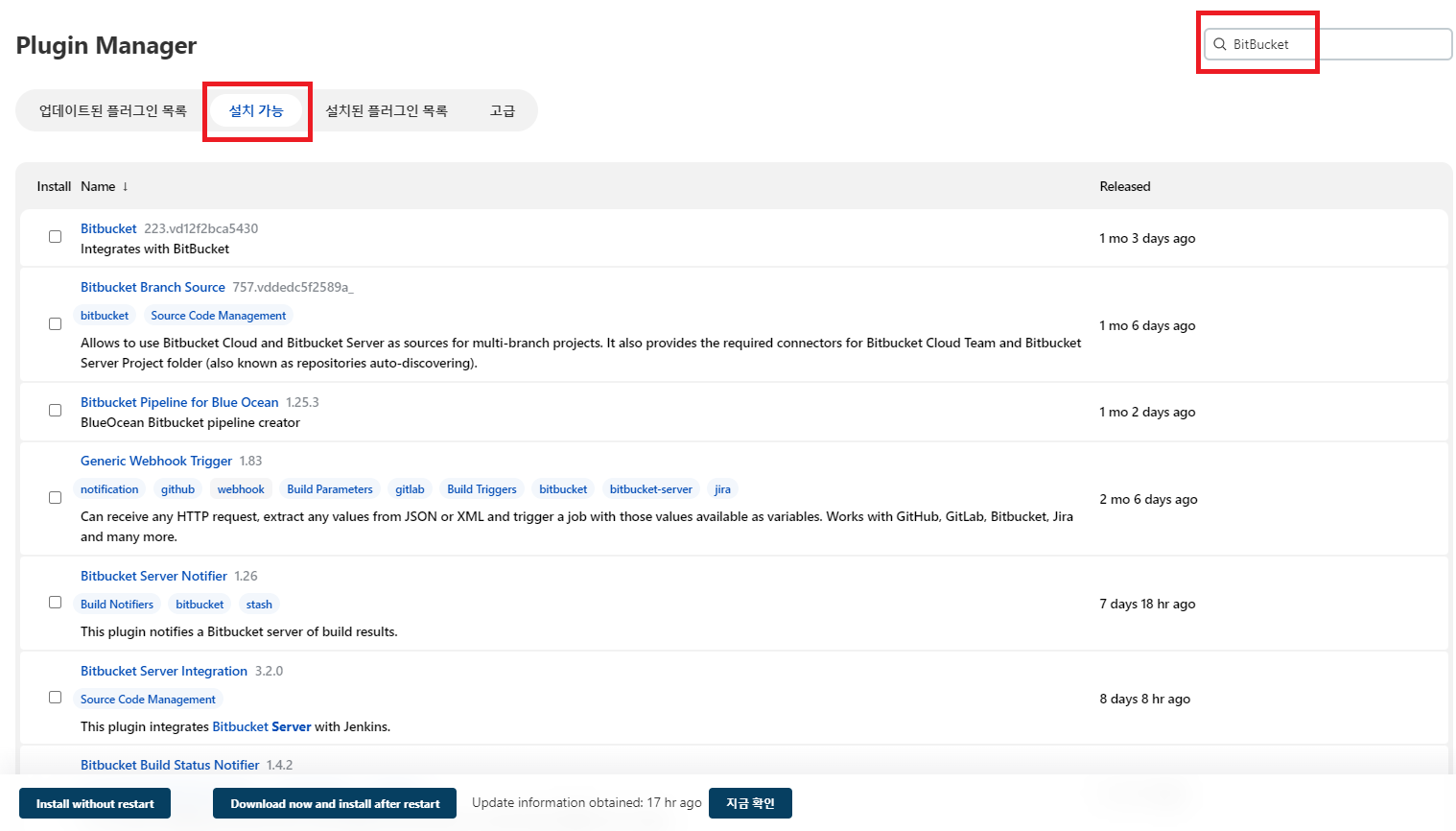 [설치 가능] 탭을 선택하고, 우측 상단 필터에서 Bitbucket을 검색합니다.