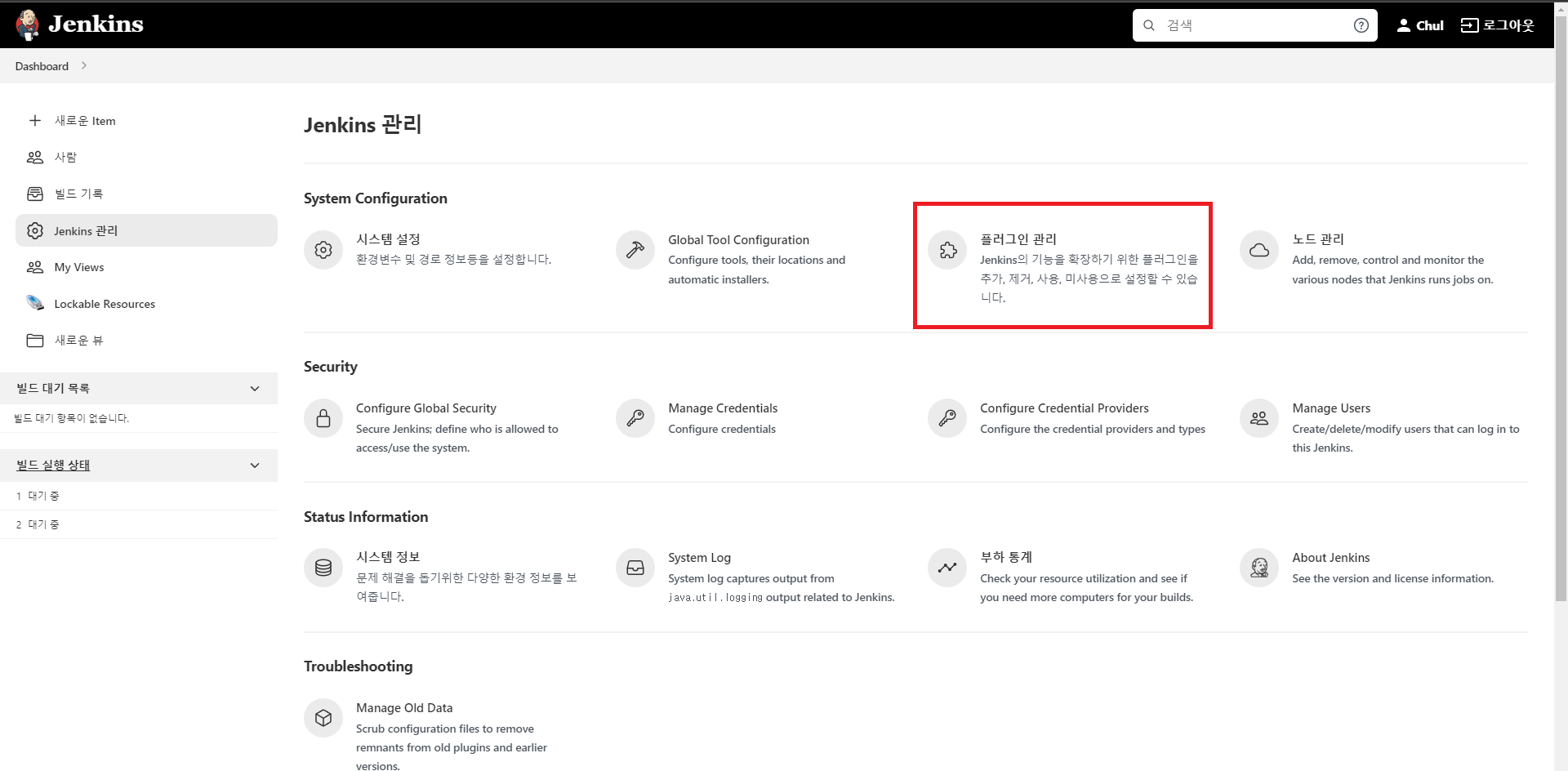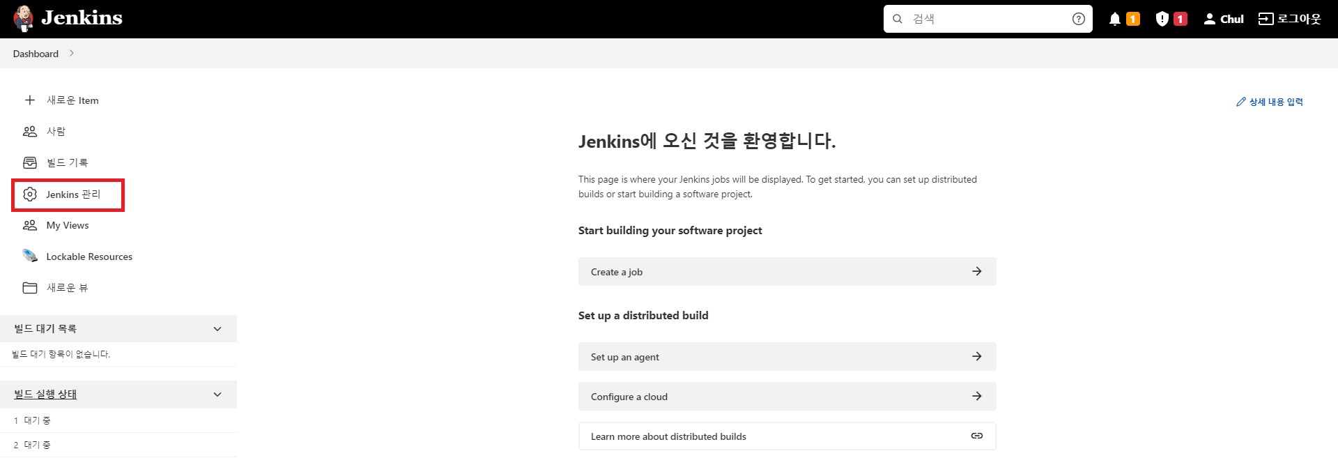 먼저 browser에 ip:port로 Jenkins에 접속한 후 로그인 한 후, 좌측 메뉴에 [Jenkins관리]로 들어갑니다.