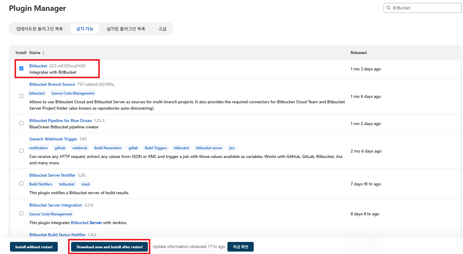 맨 위에 있는 Bitbucket을 선택하고 하단에 [Download now and install after restart]를 클릭합니다.