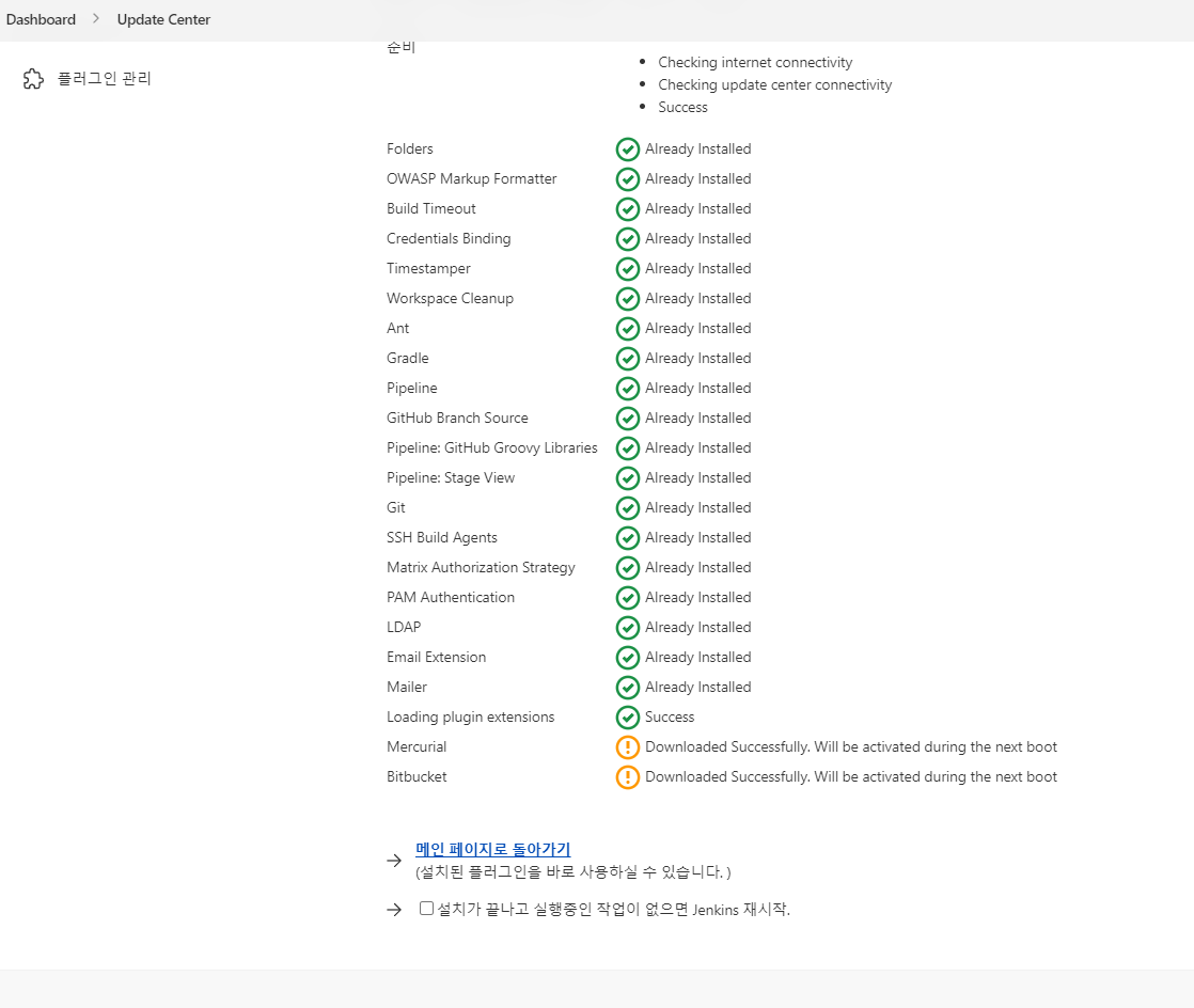 결과 화면에서 기다리면 Downloaded Successfully. Will be activated during the next boot 문구가 나타납니다. Jenkins를 재시작 비트버켓 플러그인의 설치가 완료됩니다.