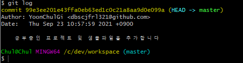 git log 명령어는 프로젝트의 커밋 내역을 확인해 볼 수 있습니다. 저자, 날짜, 커밋메세지 등이 보이네요 !