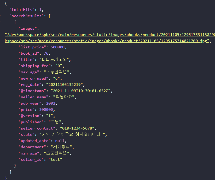 boolQuery.must(QueryBuilders.matchQuery("title", "피노")); 부분을 보면, title 이 "피노"인 문서를 검색하는 것이고, 당연히 결과는 0건입니다.