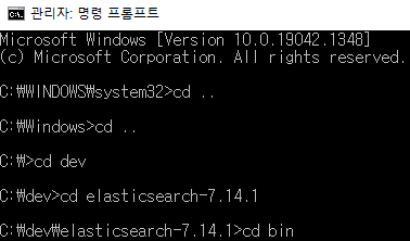 3. 엘라스틱 서치 실행 경로 밑에 bin 경로로 이동합니다.