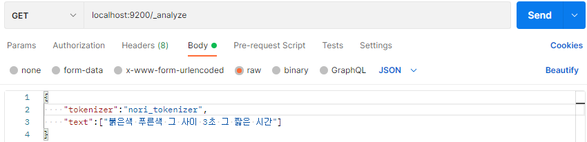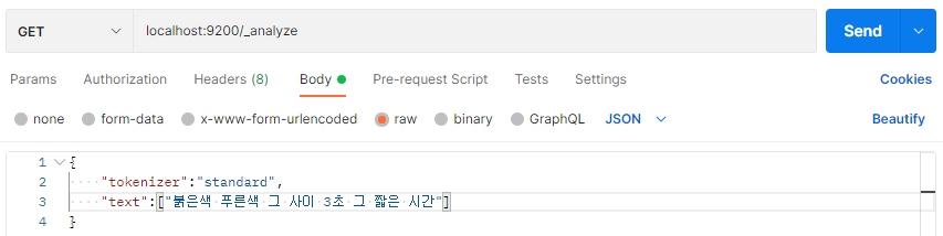저는 postman 프로그램으로 요청하여 테스트를 해보겠습니다. 먼저 standard tokenizer를 통하여 기존 분석 값을 확인합니다.