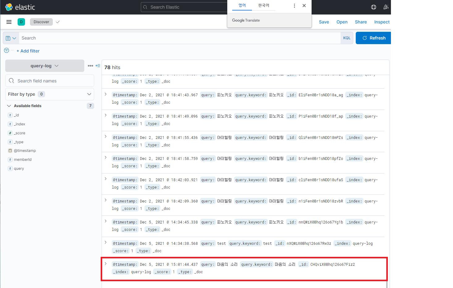 해당 메서드를 통하여 query-log 인덱스의 @timestamp 필드에 현재 시간을 기록하고 검색한 사람의 아이디, 해당 검색의 검색어 또한 기록합니다.