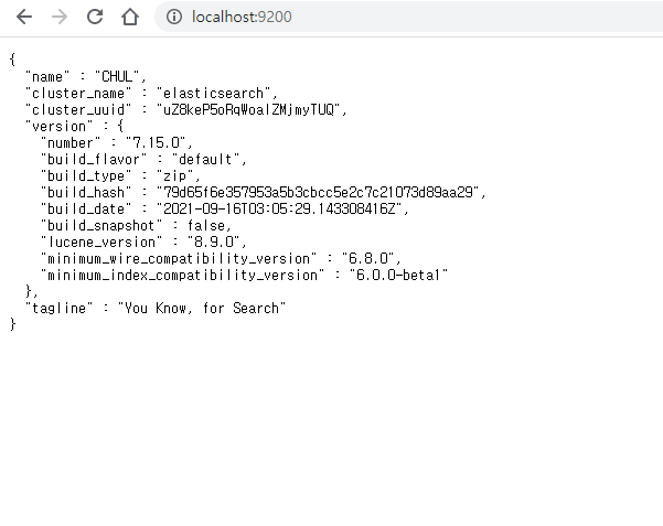 localhost 9200 포트로 접속하면 You Know, for Search 라는 메세지와 함께 정상적으로 구동되고 있는 것을 확인할 수 있습니다.