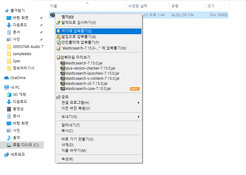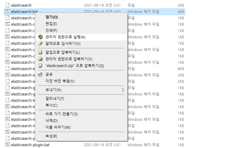 elasticsearch.bat 파일을 우클릭하여 관리자 권한으로 실행을 선택합니다.