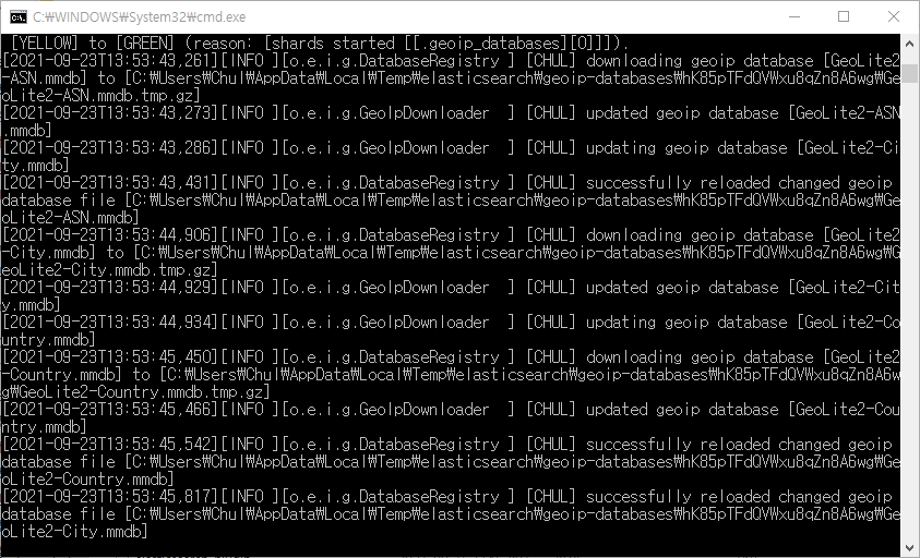 cmd창에 elasticsearch가 실행된 모습입니다. 잠시 기다렸다가 로그가 멈추면 브라우저로 테스트를 할 수 있습니다.