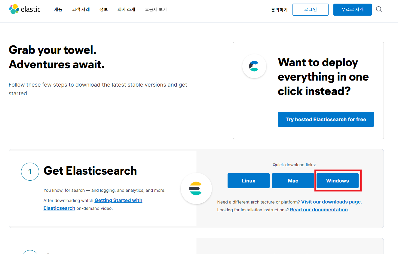 windows 버튼을 클릭하여 최신버전의 elasticsearch 압축파일을 다운받습니다.