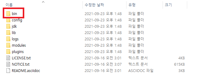 압축풀린 폴더 하위의 bin 으로 이동합니다.