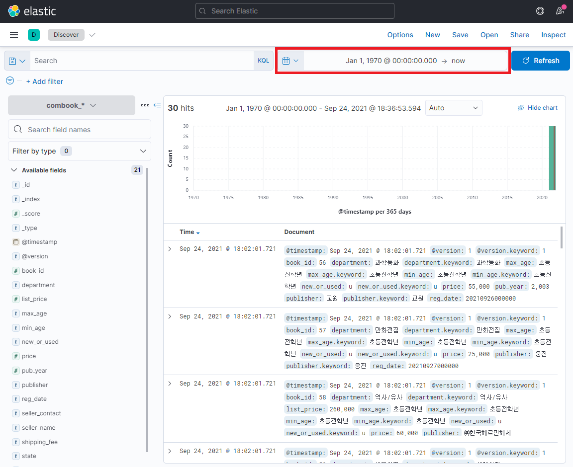 Discover 의 우상단에 달력버튼을 통하여 시간 데이터값을 입력해주면, 데이터를 확인해 볼 수 있습니다.