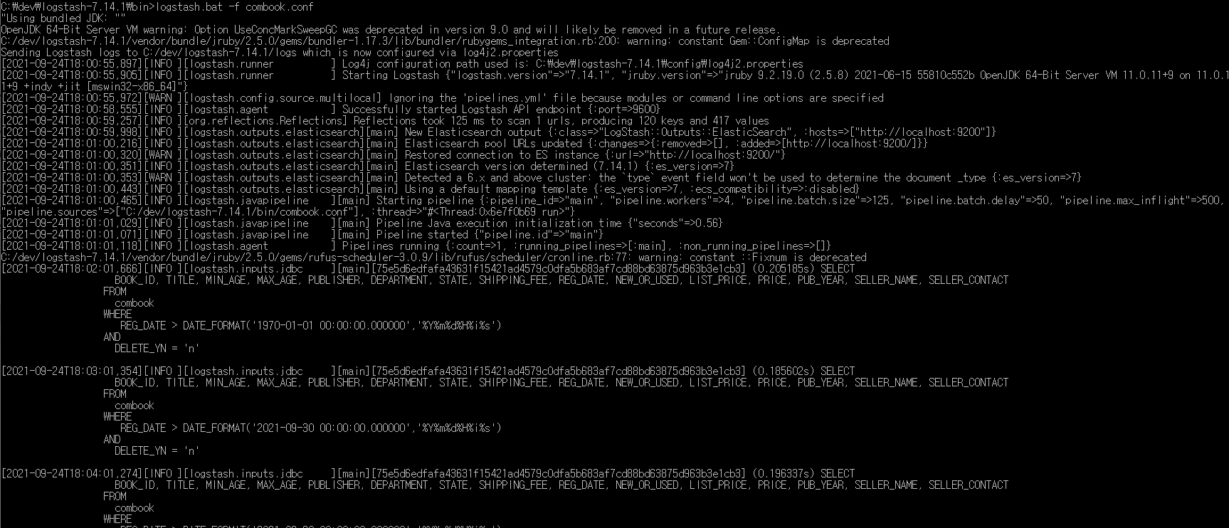 combook.conf 파일 작성이 완료되었으니, Logstash를 실행하여 DB의 데이터를 수집합니다.