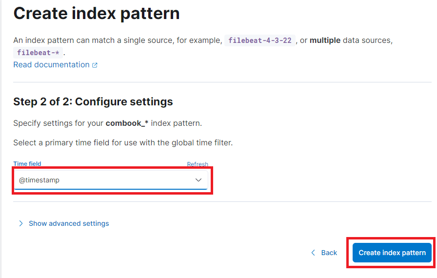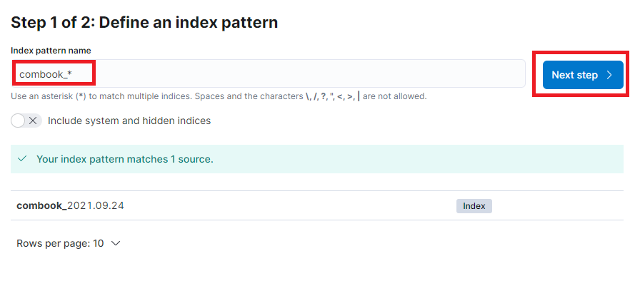 Index pattern name에 우리가 index에 지정해준 이름을 기입합니다. 끝에 *이 자동으로 붙기 때문에 combook_날짜 형식으로 인덱스명을 만들었기 때문에 combook_까지만 입력하였습니다.